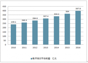 2015年我國教師培訓(xùn)市場規(guī)模為364.0億元,2016年我國教師培訓(xùn)市場規(guī)模增長至397.8億元,規(guī)模較上年同期增長9.3%。