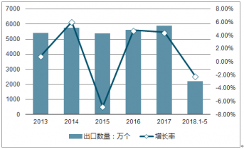2018年1-5月中國出口微波爐2230萬個(gè),同比下降2.2%;縱觀近五年中國微波爐出口數(shù)量情況,年均復(fù)合增長率為0.78%。