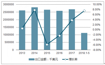2018年1-5月中國(guó)微波爐出口金額為11.17億美元,同比增長(zhǎng)7.6%;縱觀近五年中國(guó)微波爐出口金額情況,年均復(fù)合增長(zhǎng)率為2%。