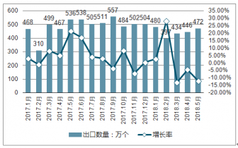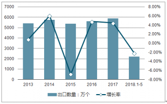 2018年1-5月中國(guó)出口微波爐2230萬個(gè),同比下降2.2%;縱觀近五年中國(guó)微波爐出口數(shù)量情況,年均復(fù)合增長(zhǎng)率為0.78%。