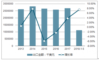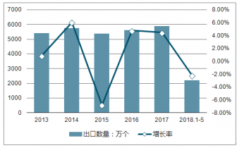 2018年1-5月中國出口微波爐2230萬個,同比下降2.2%;縱觀近五年中國微波爐出口數(shù)量情況,年均復(fù)合增長率為0.78%。