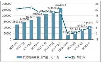 2018年5月,中國發(fā)動機(jī)產(chǎn)量達(dá)24019萬千瓦,同比增長11.4%。2018年1-5月中國發(fā)動機(jī)累計產(chǎn)量11.5億千瓦,累計增長4.7%。