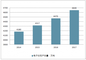 2016年共產(chǎn)生4470萬公噸電子垃圾,較2014年的4140萬公噸相比大幅上漲8%。2017年產(chǎn)生4649萬公噸電子垃圾,預(yù)測到2021年,全球電子垃圾可能增長17%,達(dá)5220萬公噸左右。