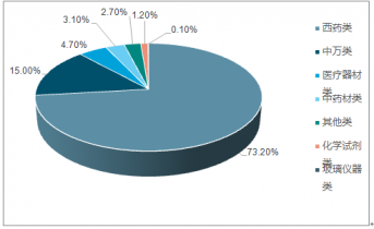 按銷售品類分類,西藥類銷售居主導地位,銷售額占七大類醫(yī)藥商品銷售總額的73.2%,其次為中成藥類占15.0%,中藥材類占3.1%,醫(yī)療器材占4.7%,化學試劑類占1.2%,玻璃儀器類占0.1%,其他類占2.7%。