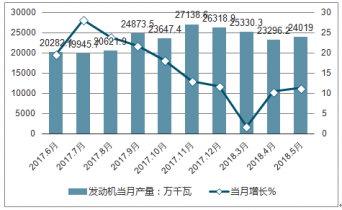 2018年5月,中國發(fā)動機(jī)產(chǎn)量達(dá)24019萬千瓦,同比增長11.4%。2018年1-5月中國發(fā)動機(jī)累計(jì)產(chǎn)量11.5億千瓦,累計(jì)增長4.7%。