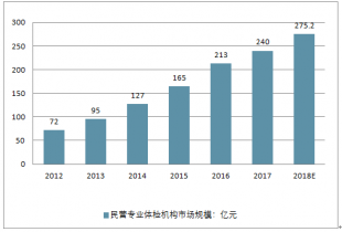 公立醫院體檢部門和民營專業體檢機構市場規模不斷擴大,預計2018年公立醫院體檢部門市場規模超1200億元,民營專業體檢機構市場規模將達275.2億元。