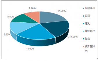 而在具體整形美容項(xiàng)目上,在手術(shù)項(xiàng)目中,眼瞼手術(shù)、吸脂手術(shù)、隆乳手術(shù)排名前三,合計(jì)占比43%。而在非手術(shù)項(xiàng)目中,肉毒素、玻尿酸注射合計(jì)占比約70%。