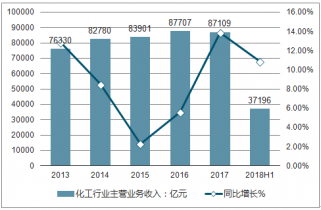2013-2018年中國化工行業(yè)主營業(yè)務(wù)收入及同比增長走勢