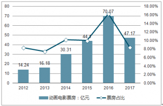 2012-2017年中國動(dòng)畫電影票房及票房占比走勢