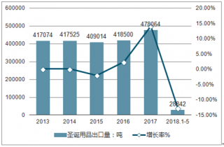 2013-2018年1-5月中國圣誕用品出口量及增長走勢