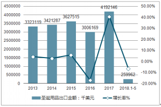2013-2018年1-5月中國圣誕用品出口金額及增長走勢