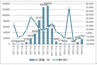 2018年1-5月中國(guó)圣誕用品2.88萬(wàn)噸,同比下降12.7%;縱觀近五年中國(guó)圣誕用品出口數(shù)量情況,年均復(fù)合增長(zhǎng)率為3.47%。