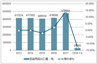2013-2018年1-5月中國(guó)圣誕用品出口量及增長(zhǎng)走勢(shì)
