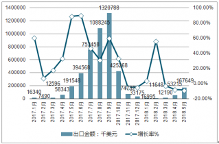 2013-2018年1-5月中國(guó)圣誕用品出口金額及增長(zhǎng)走勢(shì)