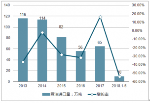 2013-2018年1-5月中國豆油進口數(shù)量及增長率走勢