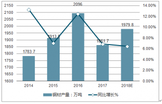 2014-2018年中國銅材產(chǎn)量及同比增長走勢