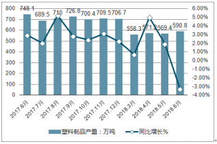 2018年6月全國塑料制品產(chǎn)量為590.8萬噸,當月同比下降3.3%;2018年1-6月全國塑料制品產(chǎn)量累計為3158.3萬噸,累計同比增速1.6%。