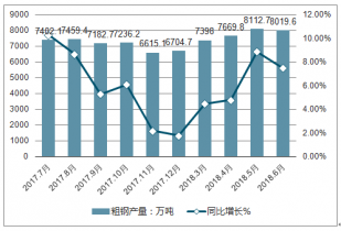 2018年6月中國(guó)粗鋼產(chǎn)量為8019.6萬(wàn)噸,與去年同期相比增長(zhǎng)7.5%,1-6月全國(guó)粗鋼產(chǎn)量為45115.7萬(wàn)噸,與去年同期相比增長(zhǎng)6%。