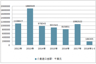 圖表 2013-2018年中國小麥行業(yè)相關(guān)產(chǎn)品進(jìn)口金額