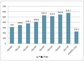 2017年中國合成橡膠產(chǎn)量578.7萬噸。2018年1-5月,中國合成橡膠產(chǎn)量累計達226.1萬噸,同比增長9.4%。