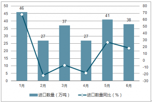 2018年1-6月中國合成橡膠(包括膠乳)進口量及同比增長走勢
