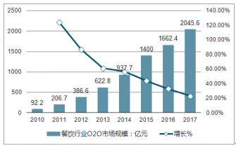 數據顯示,2010-2016年中國餐飲行業O2O市場規模不斷擴大,隨著技術的擴大其增長率在2011年總體表現為下降變動;2016年中國餐飲行業O2O市場規模增長到1662.4億元,同比增長33.00%,較2015年增加262.4億元,增長率降低10.78個百分點。預計到2018年中國餐飲行業O2O市場規模將突破2000億,達到2045.6億元;中國在線訂餐市場正在進入穩定期,未來市場增長將主要來自于平臺對已有用戶流量的挖掘。