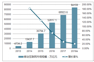 2013-2018年中國移動互聯(lián)網(wǎng)市場規(guī)模及增長走勢
