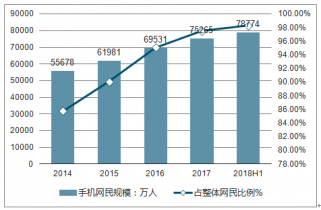 2014-2018年中國手機(jī)網(wǎng)民規(guī)模及占整體網(wǎng)民比例走勢