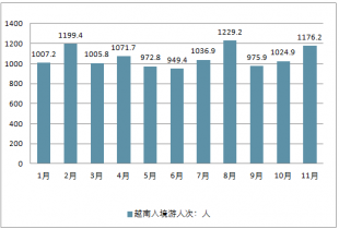 2017年越南入境人數呈現波動趨勢,二月、八月以及十二月出現旅游高峰,總體每月入境人數較少,穩定在千人左右。