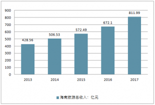 2013年海南旅游總收入僅428.56億元,5015年突破500億元,此后兩年海南旅游收入高速增長(zhǎng),2016年海南旅游總收入突破600億元,達(dá)到672.1億元,比上年增加100億元,同比增長(zhǎng)17.4%。。2017年旅游總收入再創(chuàng)新高,突破800億元,達(dá)到811.99億元,增速突破20%。五年時(shí)間,海南旅游總收入增長(zhǎng)89.5%。