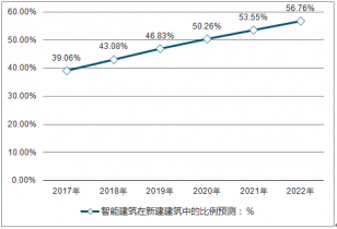 2017-2022年我國(guó)智能建筑在新建建筑中的比例預(yù)測(cè)(單位:%)