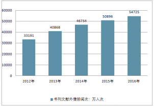 2016年公共圖書館書刊文獻外借冊次54725萬冊次,比2012年增長近66.88%;