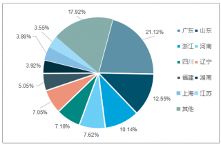 分區(qū)域來(lái)看,廣東省占全行業(yè)銷(xiāo)售產(chǎn)值的21.13%;山東省位居第二,占比為12.55%;浙江省位居第三,占比為10.14%。