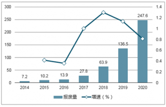 未來(lái)5年國(guó)內(nèi)新能源車(chē)的產(chǎn)銷(xiāo)量將保持快速增長(zhǎng),動(dòng)力電池的容量衰減至80%以下時(shí)就會(huì)被廢棄,實(shí)際使用時(shí)間約為3-6年。根據(jù)新能源汽車(chē)自2014年呈現(xiàn)爆發(fā)式增長(zhǎng)以來(lái),2019年動(dòng)力鋰電回收市場(chǎng)首次迎來(lái)高峰,將在未來(lái)三年保持高速增長(zhǎng)。根據(jù)數(shù)據(jù)顯示,2019年動(dòng)力電池的報(bào)廢量約2萬(wàn)噸,到2020年我國(guó)動(dòng)力電池報(bào)廢量將達(dá)到24.8萬(wàn)噸。