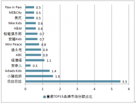 2017年中國童裝TOP15品牌市場份額占比