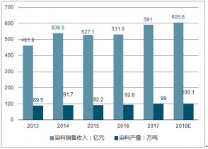 2013-2018年中國染料銷售收入及產(chǎn)量走勢