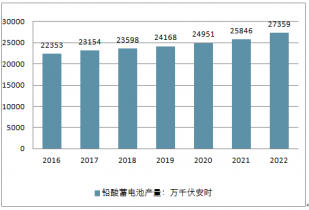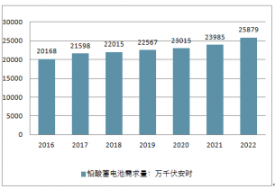 我國是全球最大的鉛酸蓄電池生產國、消費國和出口大國。我國鉛酸蓄電池行業主要實行以銷定產,鉛酸蓄電池生產數量減去出口的數量大致為國內消費數量。2016年中國鉛酸蓄電池產量為22353萬千伏安時,國內鉛酸蓄電池需求量為20168萬千伏安時,從2005年至2016年,國內企業鉛酸蓄電池產量呈波動式增長,年均復合增長率達10.17%。預計到2018年國內鉛酸蓄電池產量將達23598萬千伏安時,國內鉛酸蓄電池需求量將達22015萬千伏安時。 在“十三五”期間鉛酸蓄電池產量預計復合增長率為10.76%,預計到2022年國內鉛酸蓄電池產量將達27359萬千伏安時,國內鉛酸蓄電池需求量將達25879萬千伏安時。