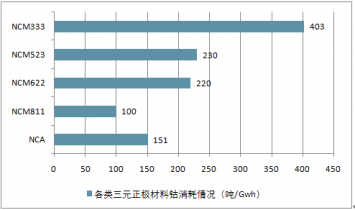 各類三元正極材料鈷消耗情況(噸/Gwh)