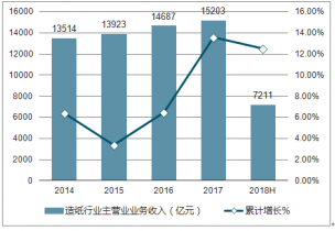 2014-2018年中國造紙行業(yè)主營業(yè)業(yè)務(wù)收入及累計增長走勢