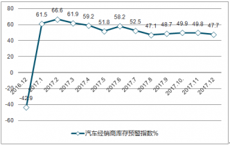 根據(jù) “汽車經(jīng)銷商庫(kù)存調(diào)查結(jié)果”,2017年12月份汽車經(jīng)銷商綜合庫(kù)存系數(shù)為0.90,同比上升10%,庫(kù)存水平位于警戒線以下。12月汽車經(jīng)銷商庫(kù)存預(yù)警指數(shù)為47.7%,也位于警戒線之下。