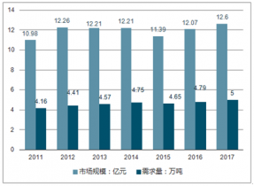 2011-2019年我國電子鋁箔需求量及需求規模變化趨勢圖(單位:萬噸,億元)