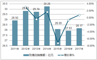 2011-2017年中國(guó)玫瑰花銷(xiāo)售額及增長(zhǎng)走勢(shì)