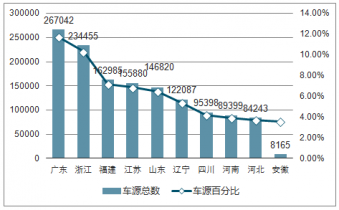 2019年5月車源量省市前三排名變化較大,廣東躍升第.一,取代浙江霸主地位,福建擠入前三,取代江蘇。從車源分布情況看,車源主要集中在東部沿海地區(qū)。10個(gè)省市車源占全國(guó)63.35%,車源總量143萬(wàn)。