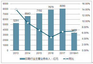 2013-2019年中國印刷行業(yè)主營業(yè)務(wù)收入及增速走勢