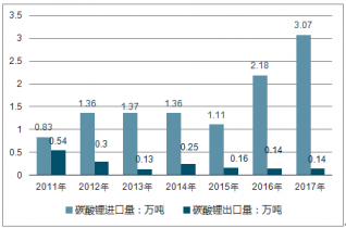 2011年-2017年國(guó)內(nèi)碳酸鋰進(jìn)出口量情況