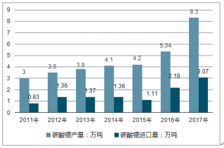 2011年-2017年國(guó)內(nèi)碳酸鋰產(chǎn)量、進(jìn)口量情況