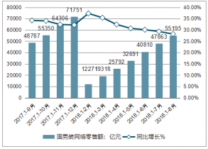 2019年1-8月全國男裝網(wǎng)絡(luò)零售額為55195億元,同比增長28.2%;其中,男裝實(shí)物商品網(wǎng)絡(luò)零售額為41993億元,同比增長28.6%。