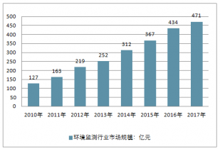 在“十二五”的政策熱潮下,我國環(huán)境監(jiān)測行業(yè)發(fā)展迅速, 2016年行業(yè)規(guī)模約為434億元,2010-2016年行業(yè)復(fù)合增速達(dá)到22.8%,2017年的市場規(guī)模在471億元左右。然而對比整個萬億級的環(huán)保市場而言,環(huán)境監(jiān)測的市場規(guī)模較小,未來市場增長空間巨大。