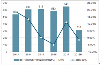 2013-2018年上半年中國客戶端游戲市場實際銷售收入及增長率走勢