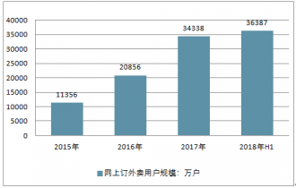 2018上半年中國手機網(wǎng)上外賣用戶規(guī)模為34359萬人,與2017年末32229萬人,相比增長2130萬人,占整體網(wǎng)民手機網(wǎng)民占比為43.6%。